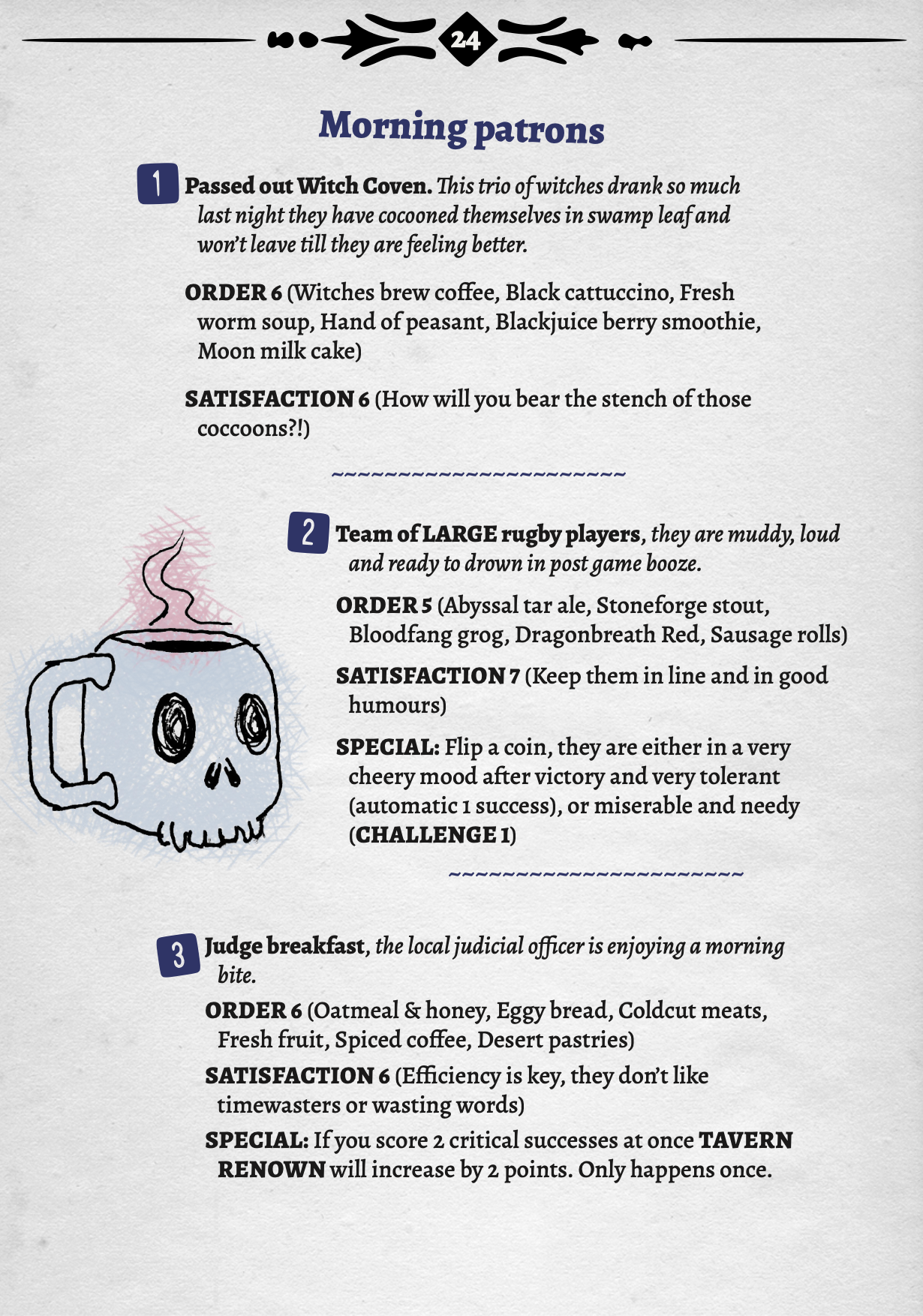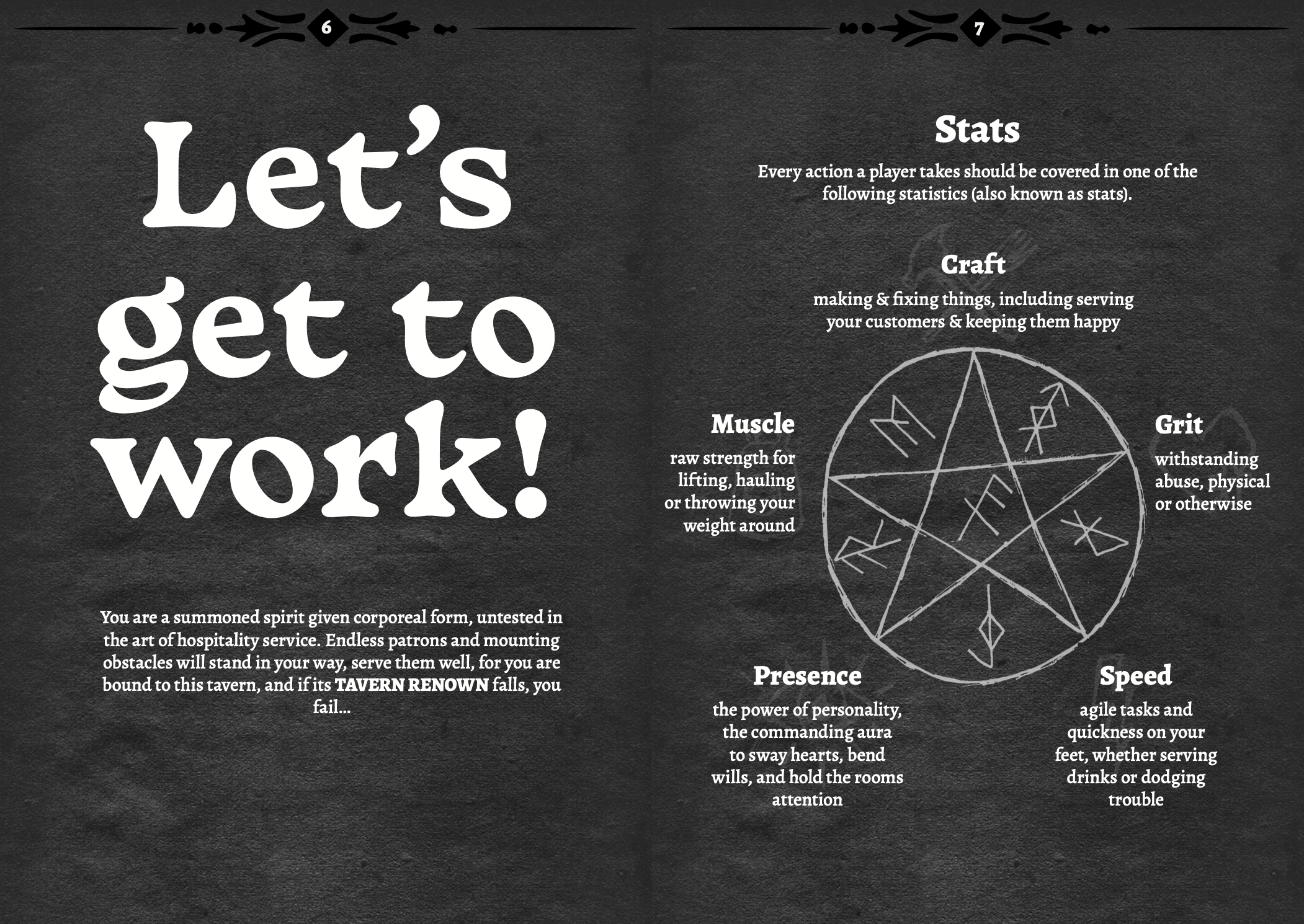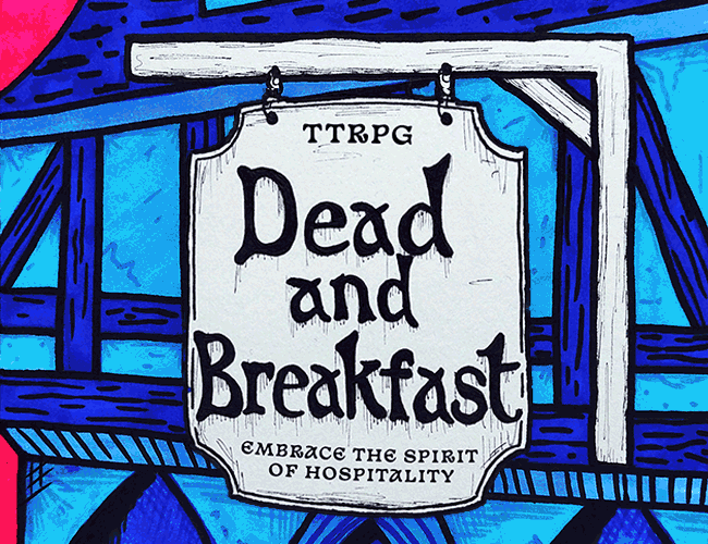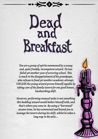 Dead and breakfast is a fantasy hospitality TTRPG where you play as summoned spirits as they attempt to fulfil their contract, and aid a lazy aspirant wizard to successfully run his Grandpapa's Tavern for one full shift.